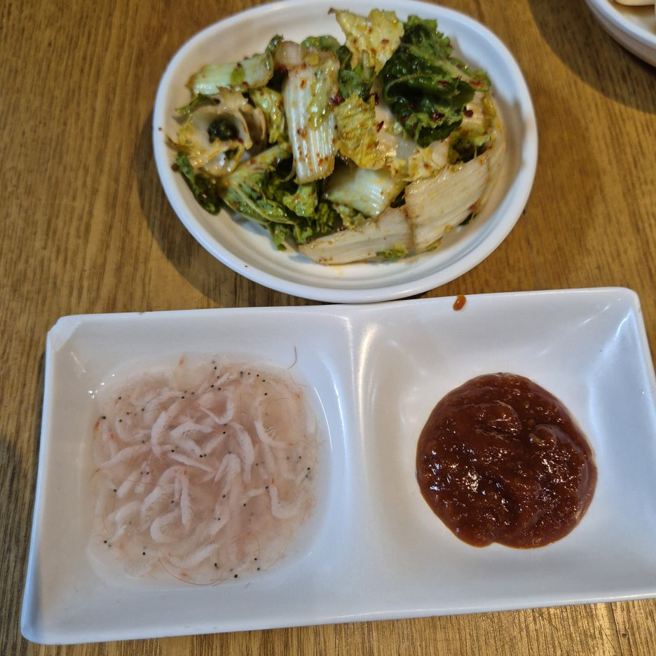 일단 반찬으로는 겉절이, 무김치, 새우젓, 쌈장,